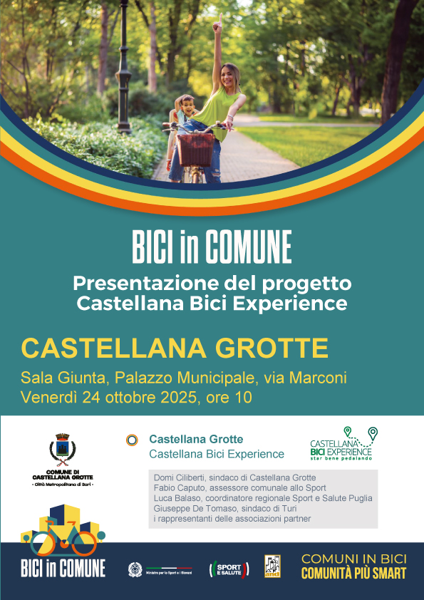 Venerdì 24 ottobre 2025 alle ore 10 presso la Sala Giunta del Palazzo Municipale di Castellana Grotte in programma la presentazione del progetto alla cittadinanza. Interverranno Domi Ciliberti, sindaco di Castellana Grotte, Fabio Caputo, assessore comunale allo Sport, Luca Balasco, coordinatore regionale Sport e Salute Puglia, Giuseppe De Tomaso, sindaco di Turi, e i rappresentanti delle associazioni che hanno sottoscritto il partenariato.